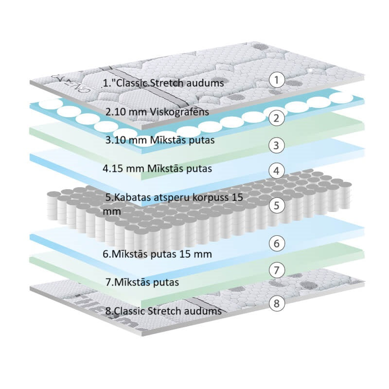 Da Vinči matracis sastāv no vidēji augstas izturības kabatas atsperu kodola, kas nodrošina optimālu atbalstu jūsu ķermenim visas nakts garumā. Kabatas atsperes arī piedāvā neticamu neatkarību, guļot pāros, jo viena cilvēka kustības netiek pārnestas uz otru. Da Vinči matracis apvieno rūpīgu augstas kvalitātes materiālu atlasi, lai piedāvātu jums nepārspējamu atpūtas pieredzi. Viena no tā pusēm ir ar 10 mm viskografēna slāni, kas ir revolucionārs materiāls, kas palīdzēs atbrīvoties no uzkrātās statiskās elektrības jūsu ķermenī. Tas ne tikai palīdz mazināt stresu, bet arī veicina dziļāku un atjaunojošāku miegu. Viskografēnam ir arī īpašība mazināt ķermeņa siltumu, to izkliedējot, padarot šo matraci ideālu tiem, kas vēlas naktī uzturēt vēsumu un kam ir pārmērīga svīšana. Otra puse piedāvā 30 mm mīkstas putas. Tas nozīmē, ka jūs varat pielāgot savu komforta līmeni atbilstoši savām individuālajām vēlmēm un mainīgajām vajadzībām visa gada garumā.